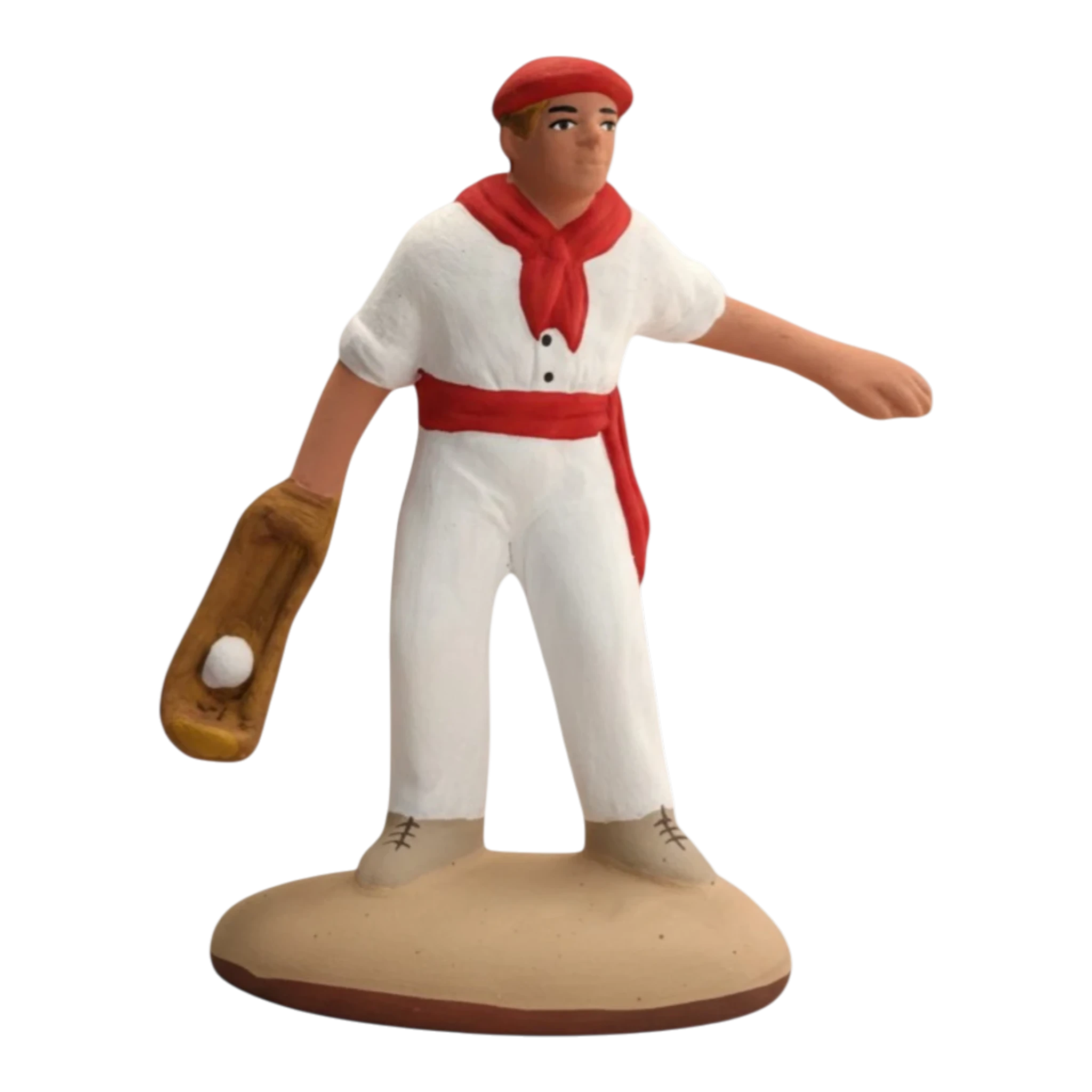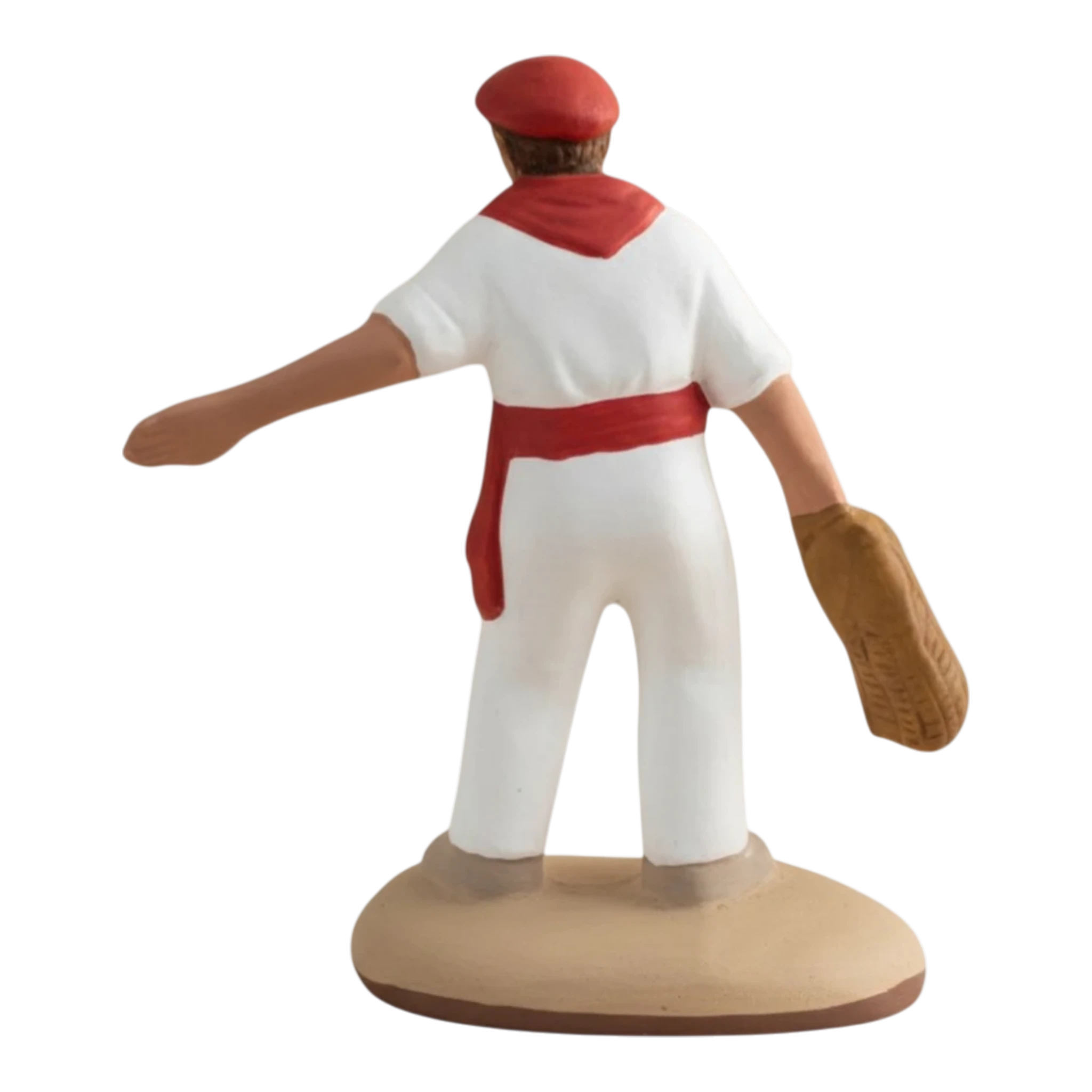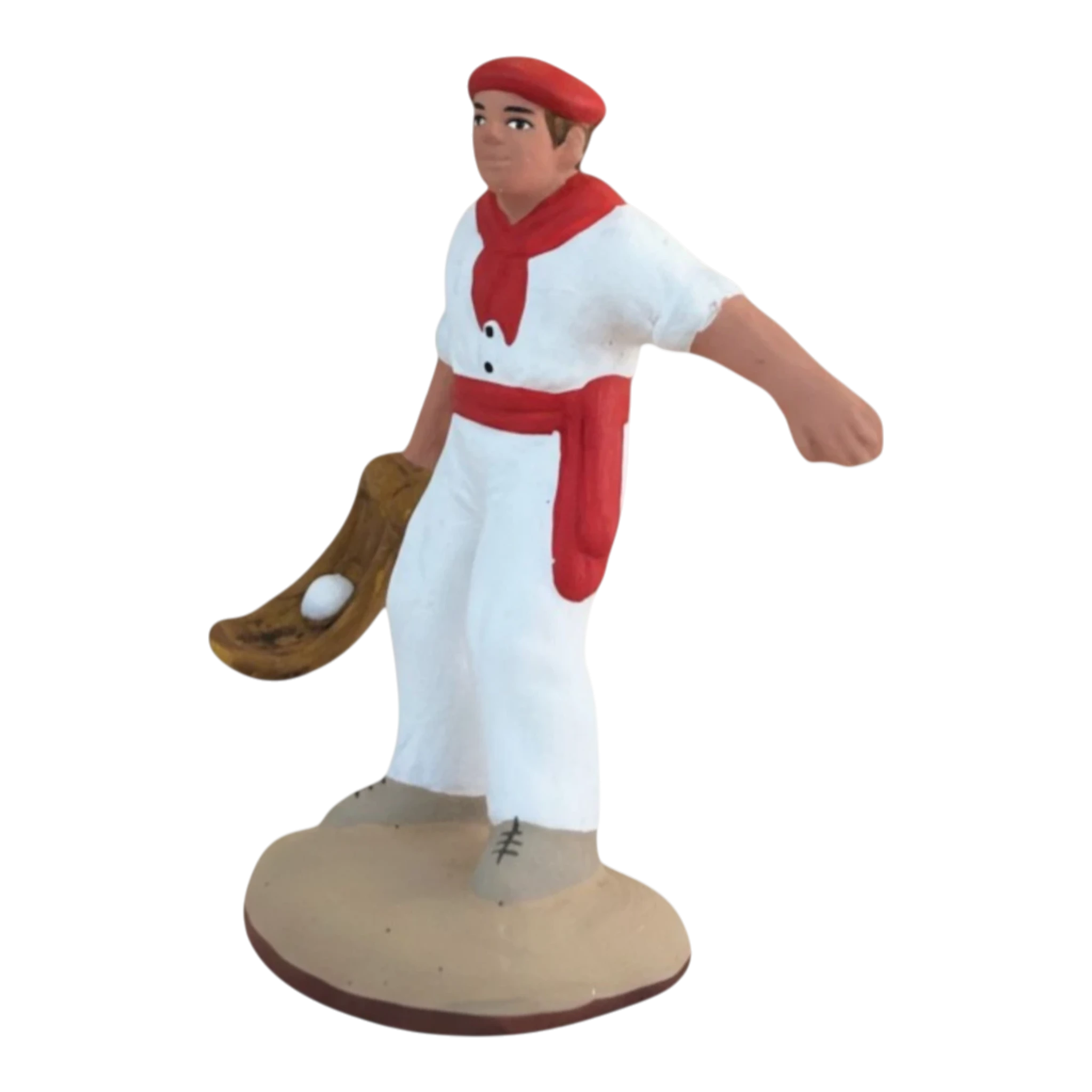 Ce santon représente avec élégance, l’athlète emblématique du Pays Basque. Vêtu de la tenue traditionnelle blanche immaculée, rehaussée par le célèbre béret rouge, la ceinture (gerrika) et le foulard assortis, il est saisi en plein mouvement. Dans sa main droite, il manie avec dextérité sa chistera (le panier en osier) prête à propulser la pelote contre le fronton. C’est une pièce de caractère qui célèbre la force, l’adresse et le patrimoine culturel des régions du sud, idéale pour varier les plaisirs et les horizons de votre décor.