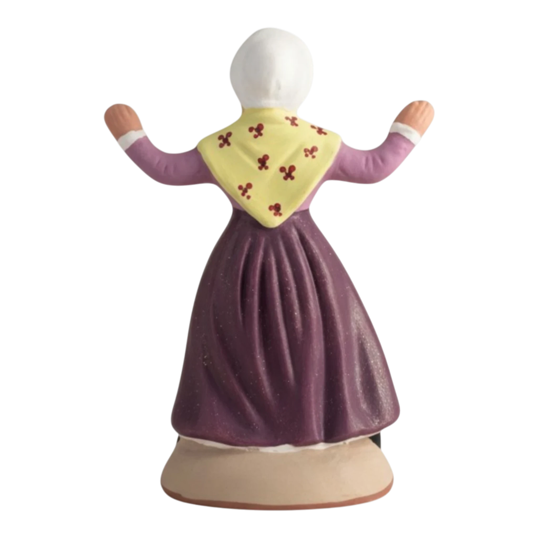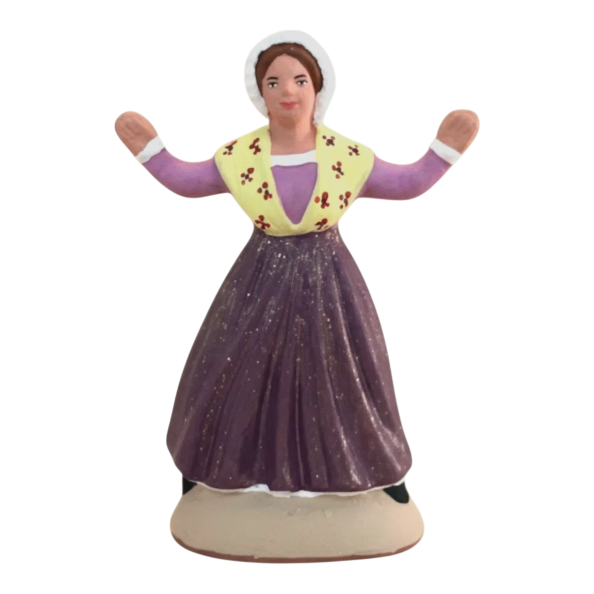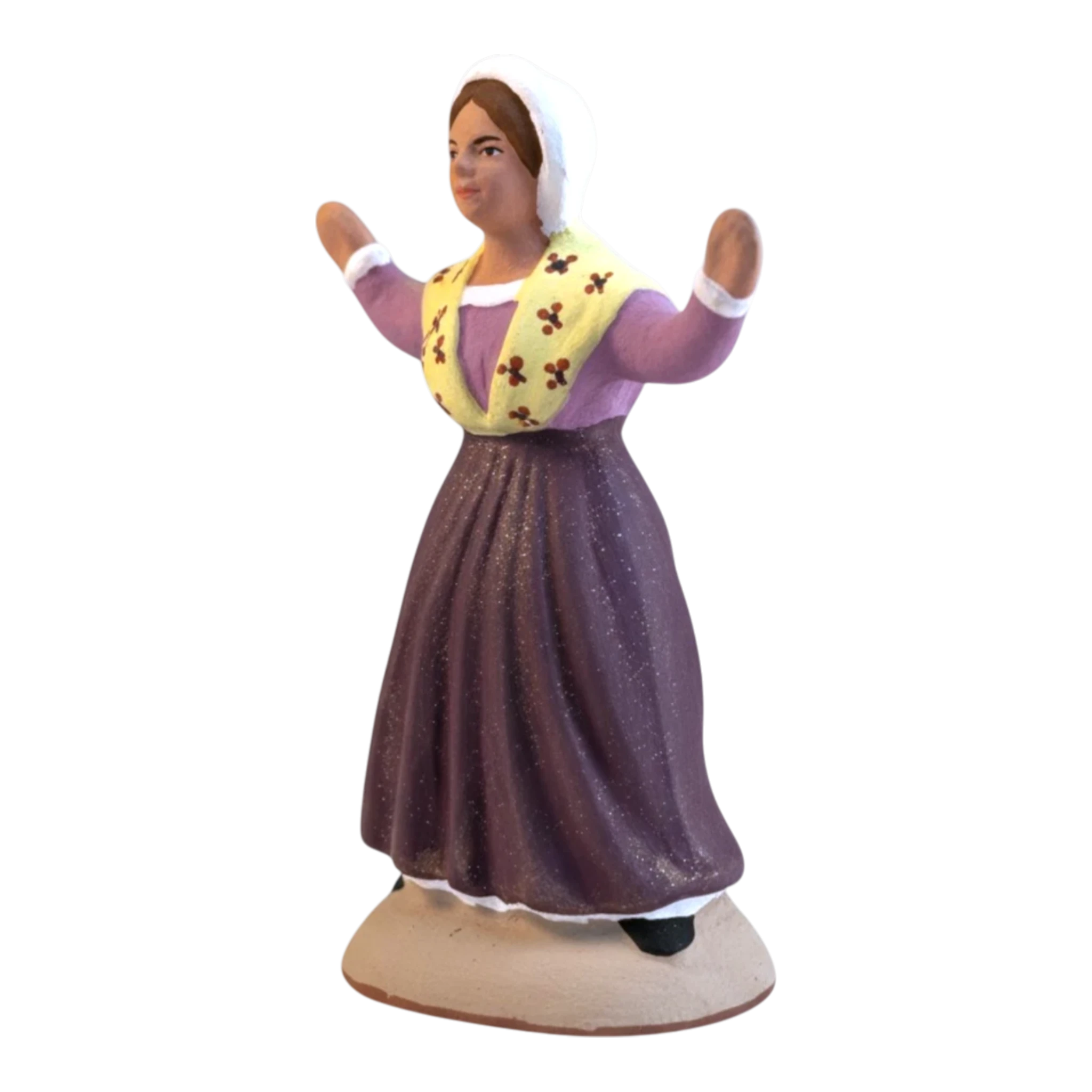 Cette danseuse rayonne par l’élégance de sa tenue traditionnelle. Elle se distingue surtout par son magnifique châle jaune clair parsemé de petites fleurs rouges. Bras ouverts et sourire aux lèvres, elle invite chaque passant à entrer dans la danse. Sa coiffe blanche immaculée souligne la finesse de son visage, faisant de ce santon une pièce pleine de douceur et de réalisme.