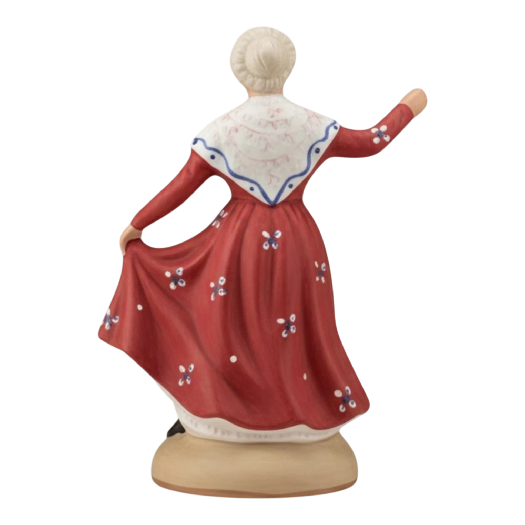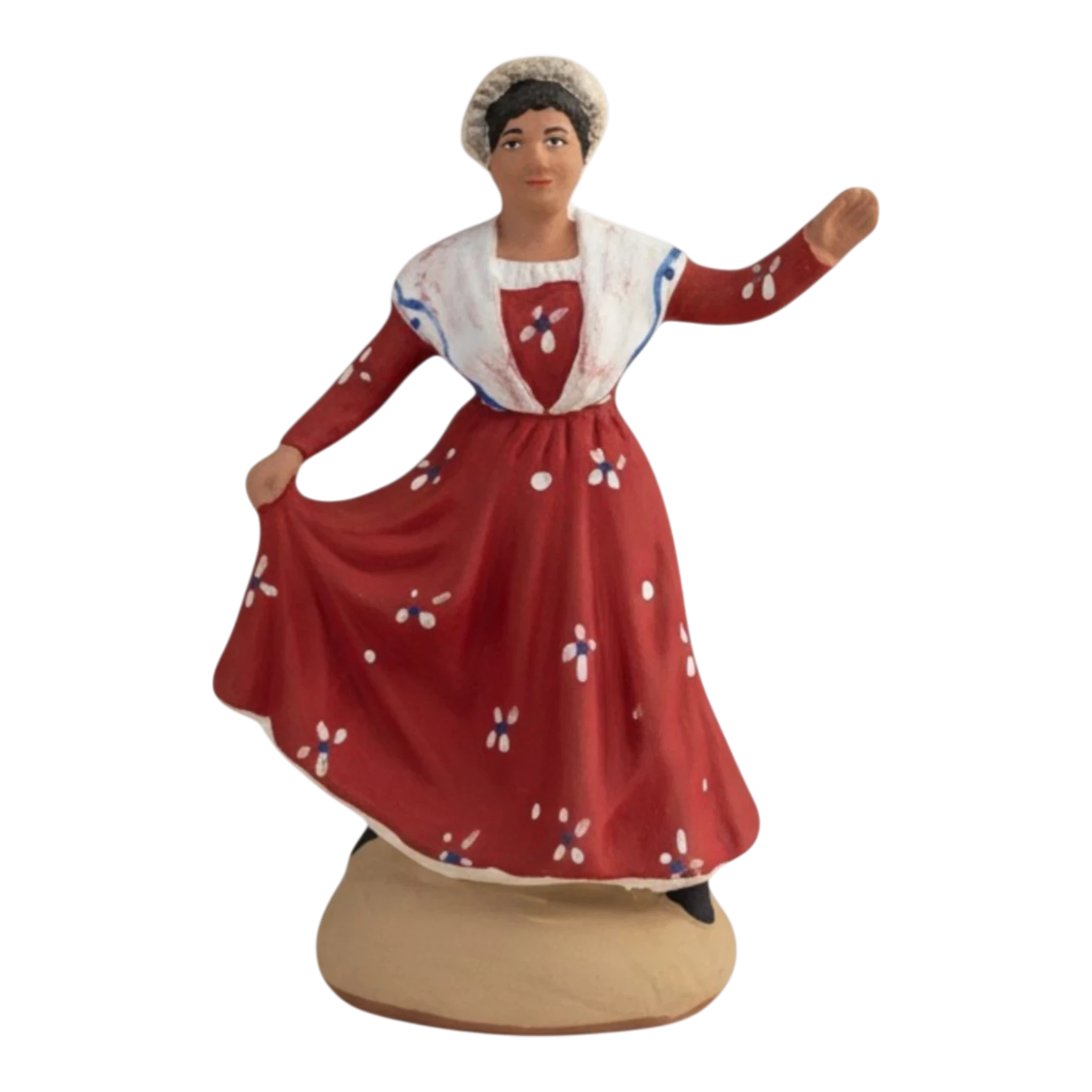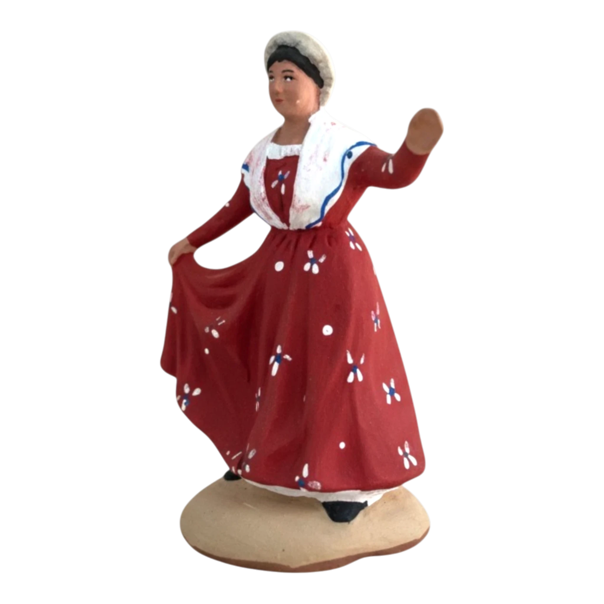 Cette danseuse est sans aucun doute l’une des pièces les plus lumineuses de la troupe. Vêtue d’une robe rouge intense parsemée de délicates fleurs blanches et bleues, elle tourbillonne sur la place du village. Son fichu blanc croisé sur la poitrine et sa coiffe traditionnelle soulignent son port de tête gracieux et son allure festive. Elle incarne parfaitement la joie de vivre et le dynamisme des farandoles qui serpentent dans les rues lors des soirs d’été.