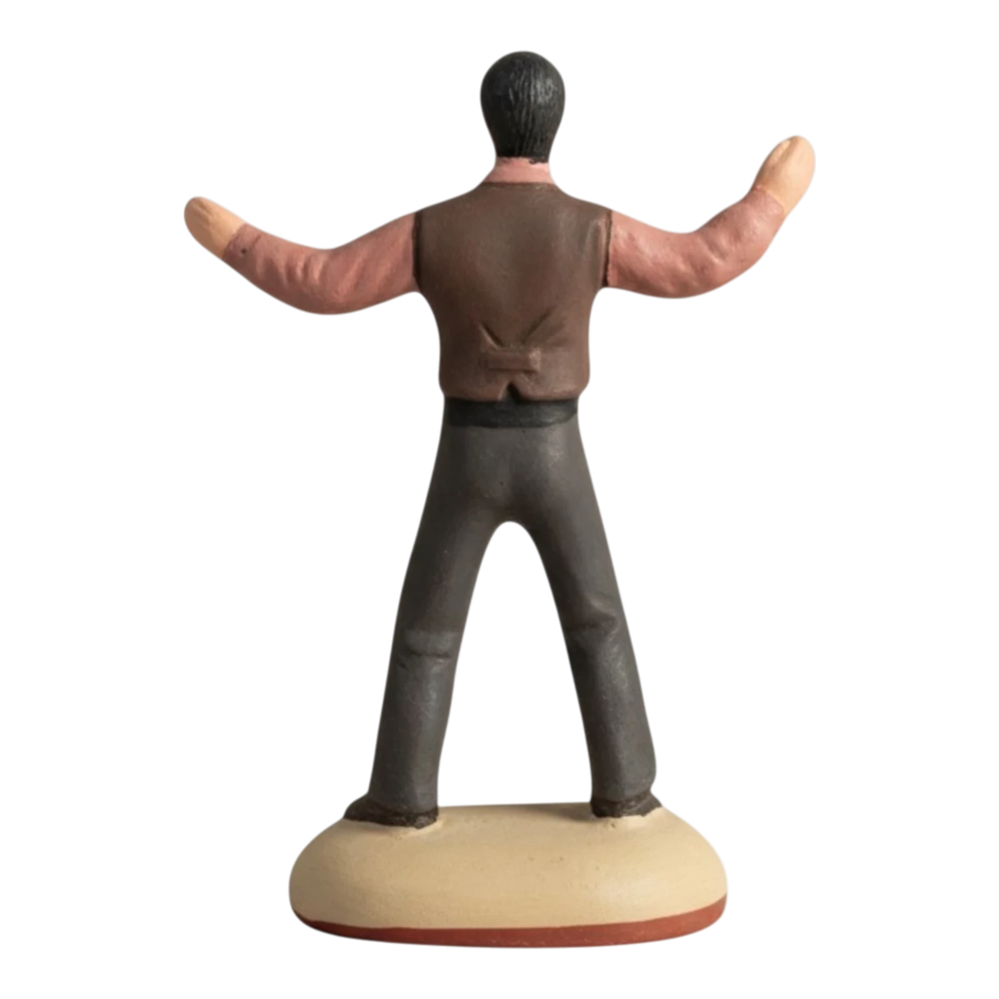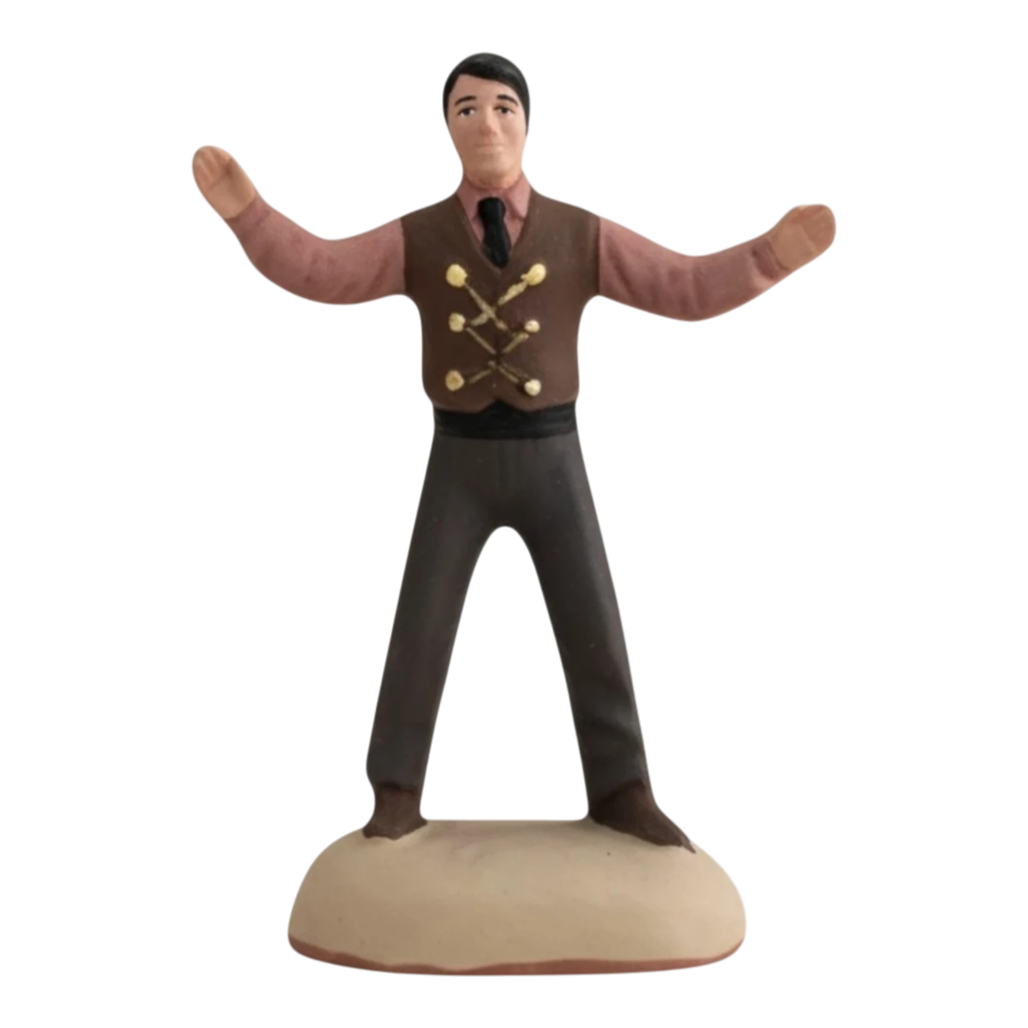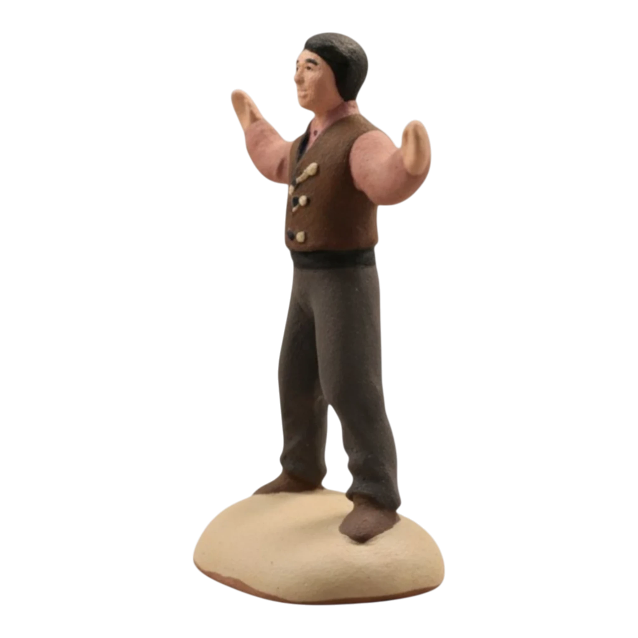 Ce danseur se distingue par son allure classique et harmonieuse. Sa posture, bras largement ouverts, évoque l’accueil et le partage, invitant les autres santons à se joindre à la fête. C’est le personnage idéal pour lier les couleurs vives de la troupe (comme le rouge ou le violet) aux éléments plus rustiques de votre décor. Le mélange du marron et du vieux rose offre un rendu visuel très apaisant et élégant, typique des costumes de fête de l’arrière-pays.