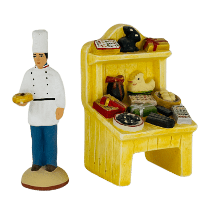 Étal façon bois, représentant tous les produits du chocolatier. On y retrouve une poule et un lapin ainsi qu’un œuf en chocolat, des boîtes de chocolats, des œufs et des tablettes.Réalisé en plâtre et entièrement peint à la main.Dimensions : 4,5 x 4 x 9 cm.Couleurs non contractuelles.