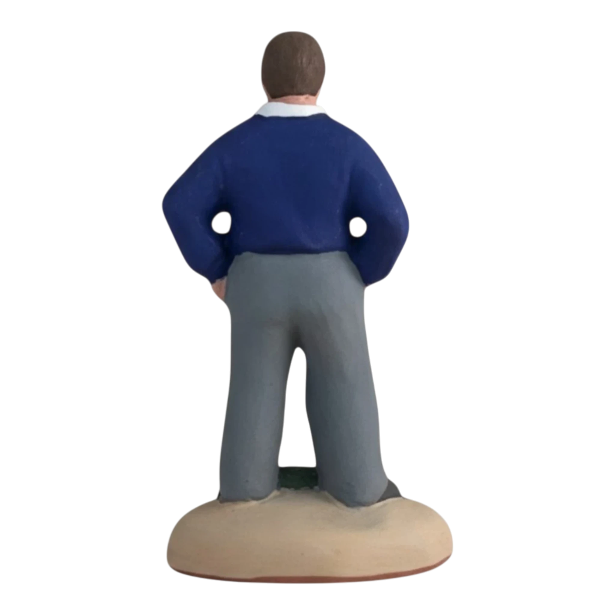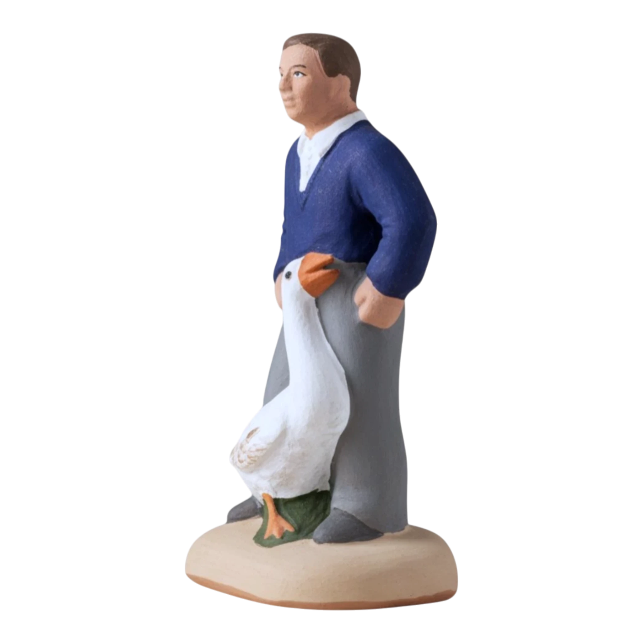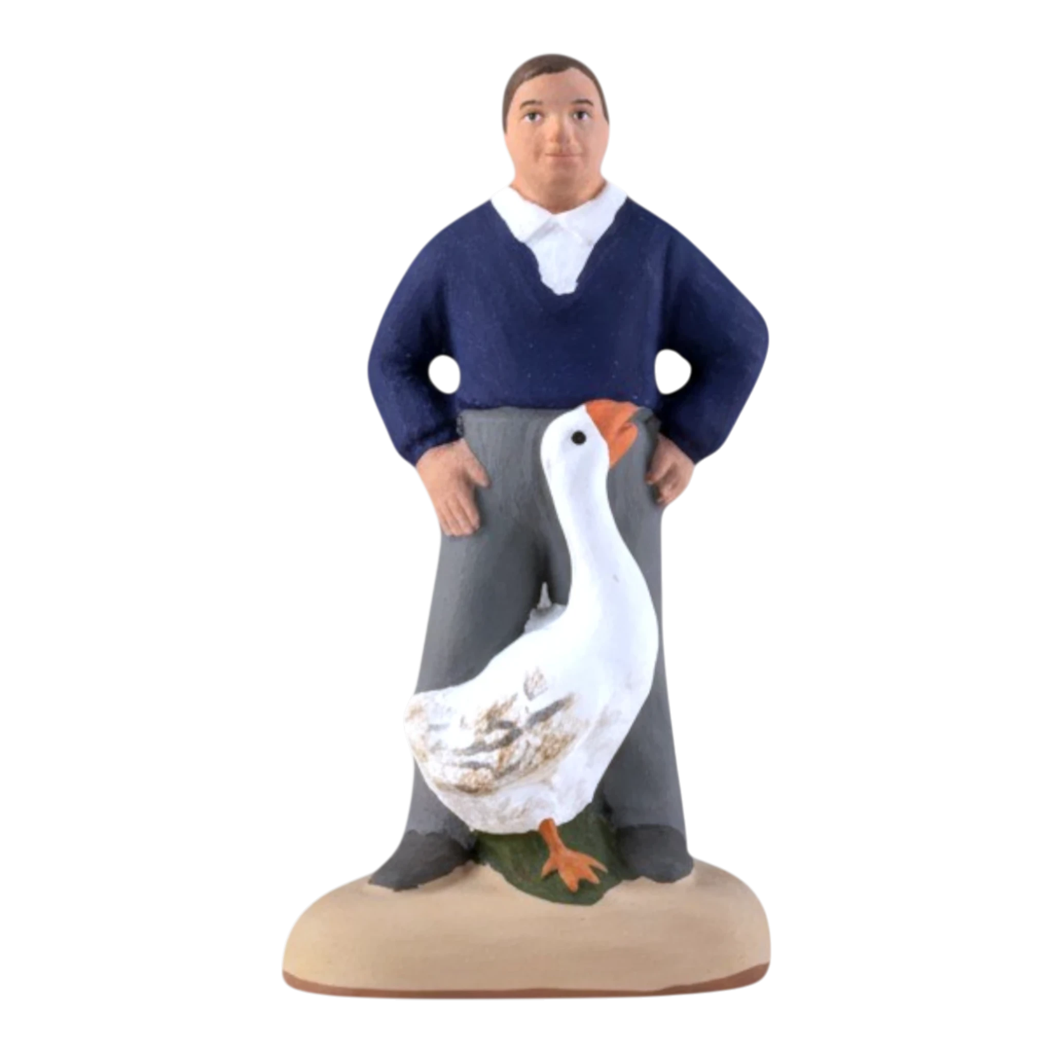 Ce santon capture un moment de complicité (et de patience !) entre un villageois et son oie. Vêtu d’un pull bleu marine classique sur une chemise blanche et d’un pantalon gris, cet homme se tient les mains sur les hanches, observant avec un sourire tranquille son oie blanche qui semble vouloir lui voler la vedette. C’est une pièce qui apporte beaucoup de réalisme et une petite touche d’humour à votre village, rappelant les scènes quotidiennes des fermes provençales d’autrefois.