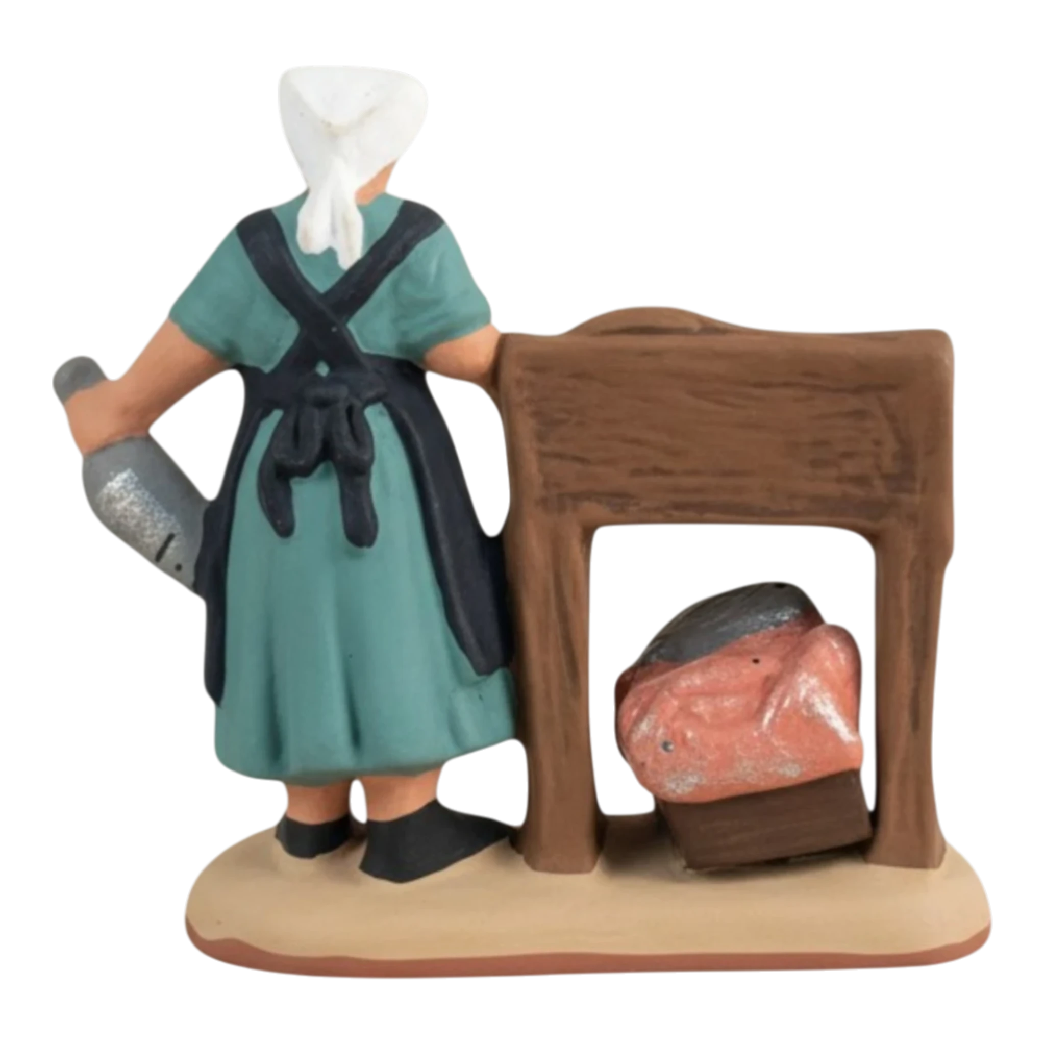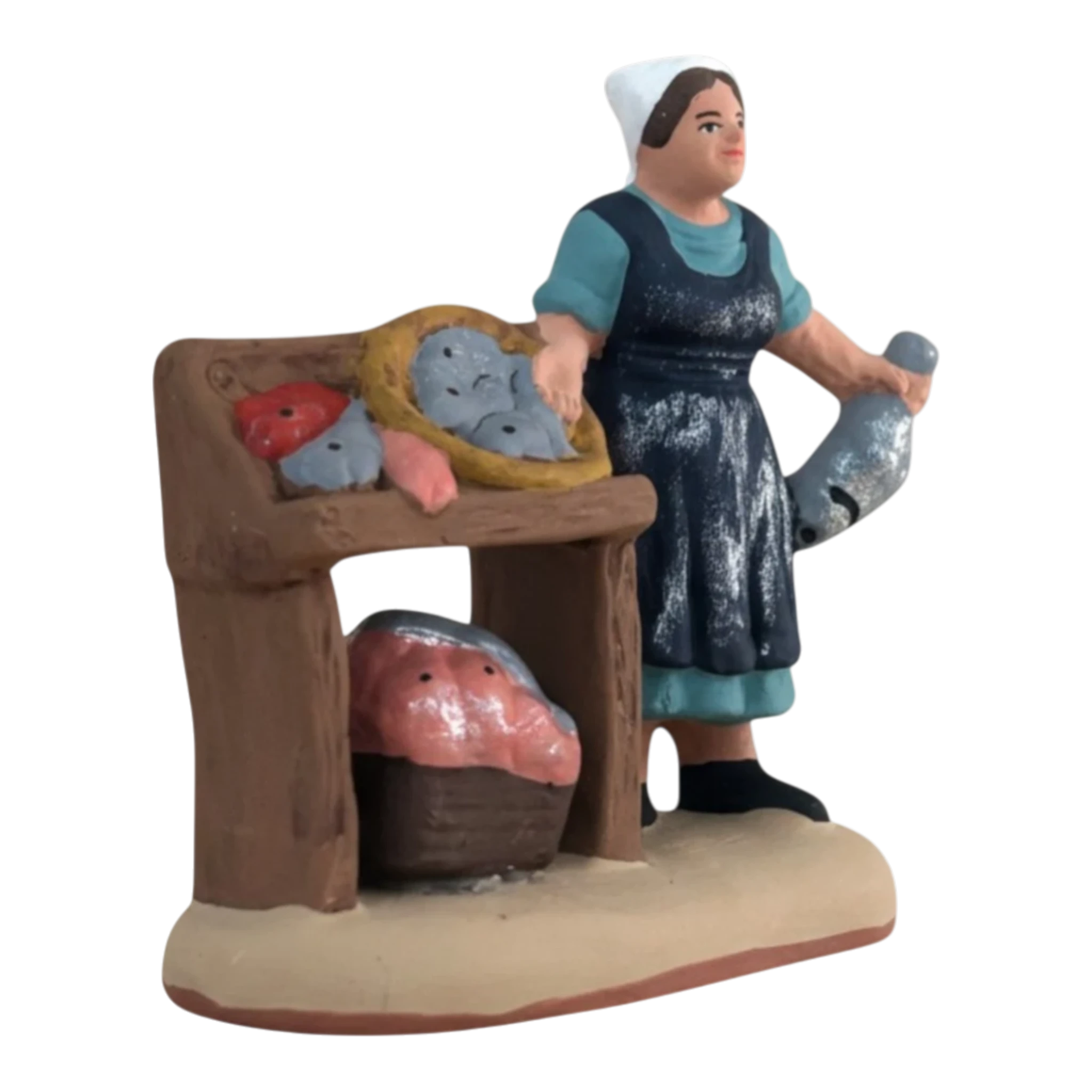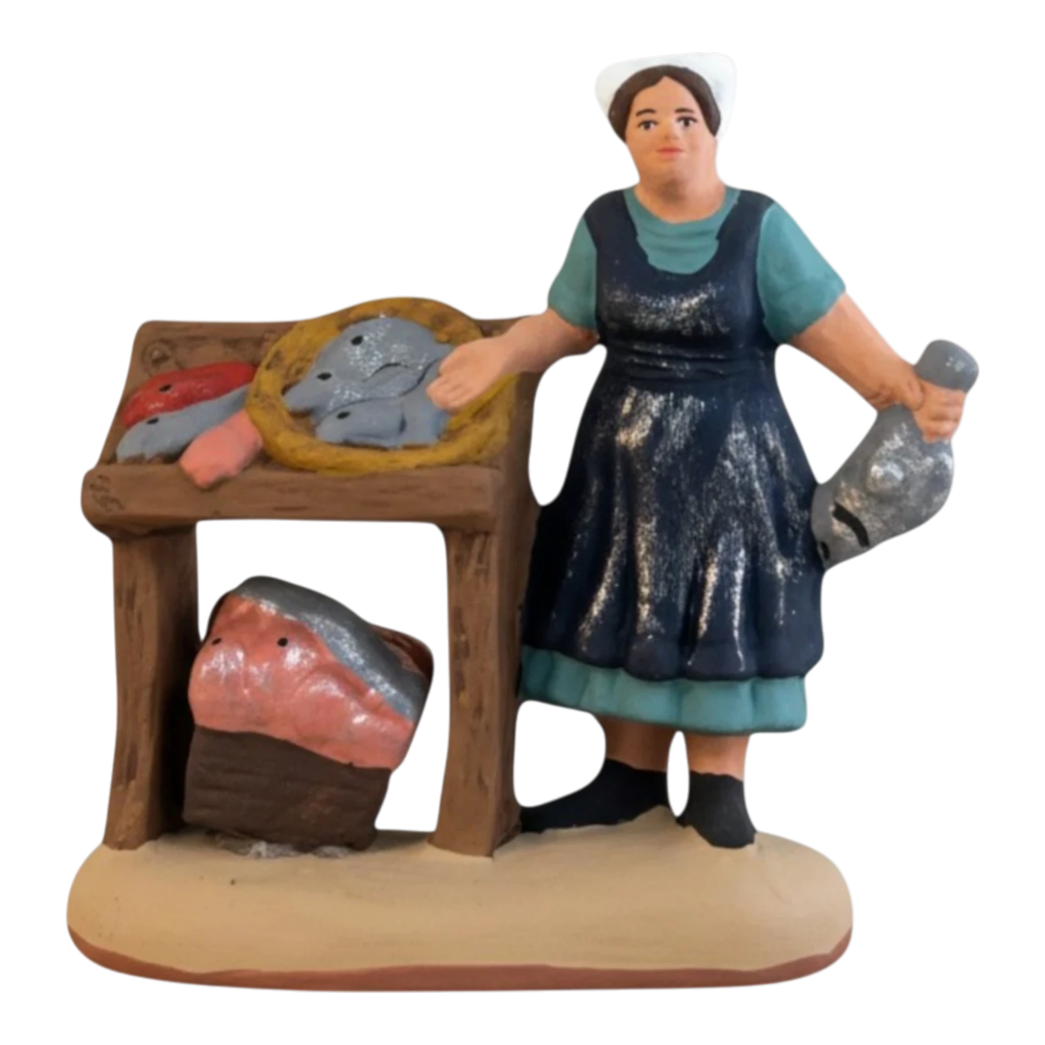 Cette poissonnière, vêtue d’un tablier bleu profond et de sa coiffe traditionnelle, présente fièrement sa pêche du jour. À ses côtés, son étal de bois regorge de détails : de belles dorades argentées, des poissons de roche et même un gros spécimen dans un panier de paille. Elle tient d’ailleurs un poisson dans sa main gauche, prête à servir le prochain client. C’est une pièce de décor complète qui raconte une histoire et apporte une touche de réalisme indispensable à toute place de village..
