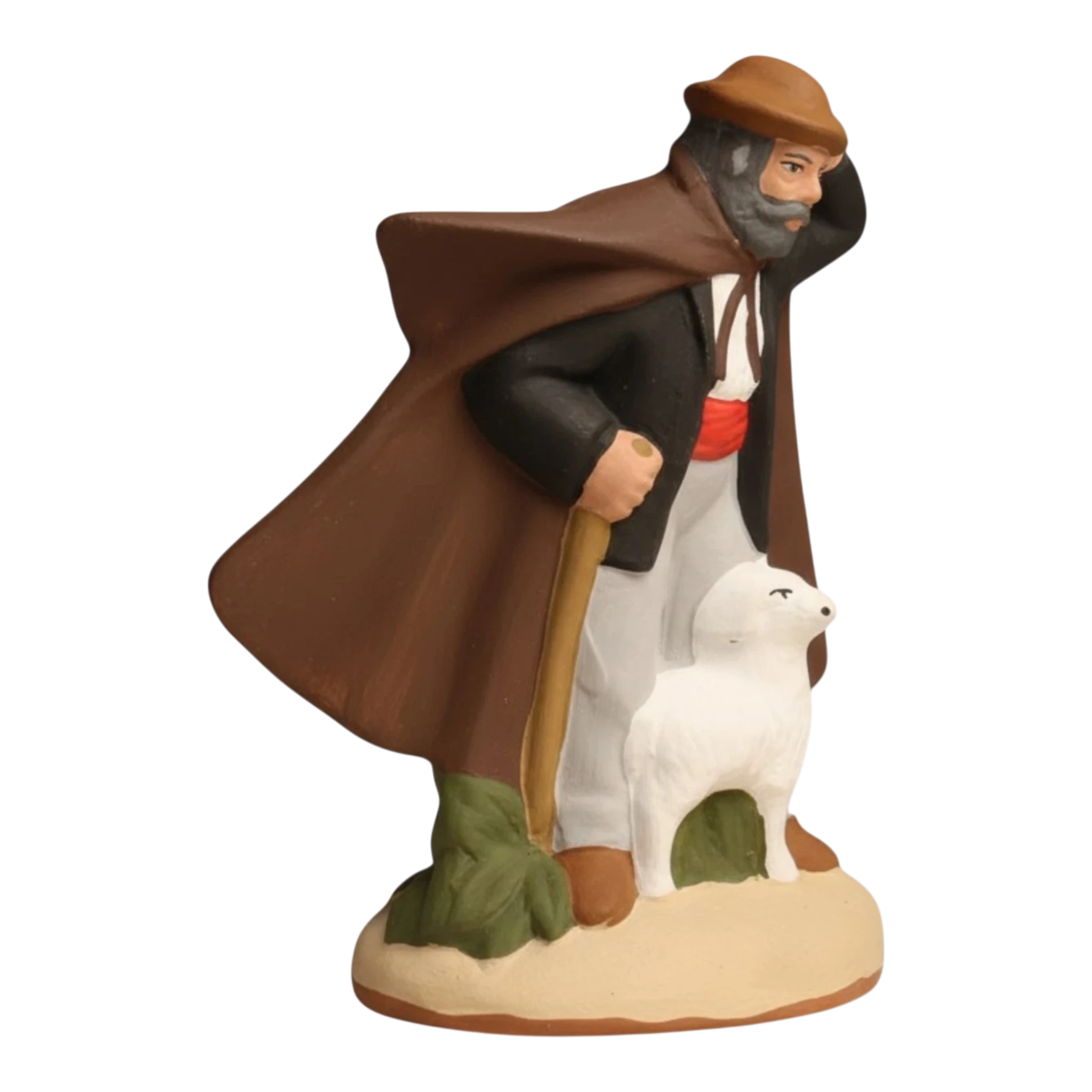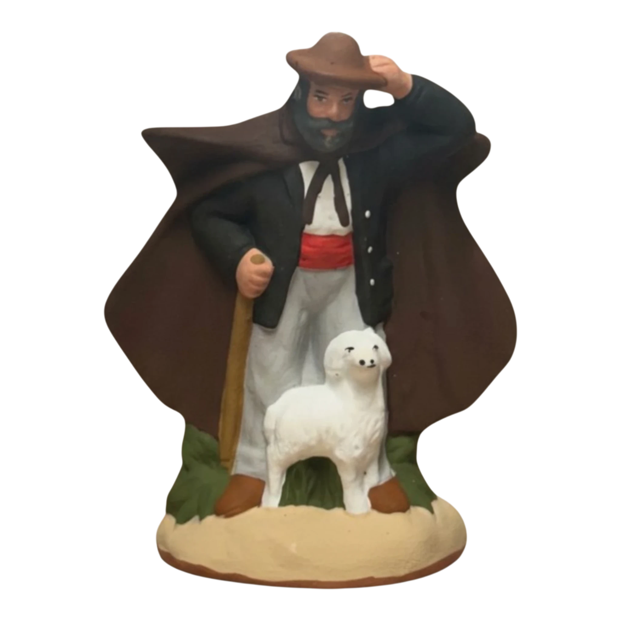Contrairement aux personnages statiques, celui-ci apporte une véritable dynamique avec sa cape « en mouvement » et son geste à la fois protecteur et vigilant. Modelé en argile et peint à la main, ce santon incarne la force et la bienveillance des gardiens de troupeaux d’autrefois.