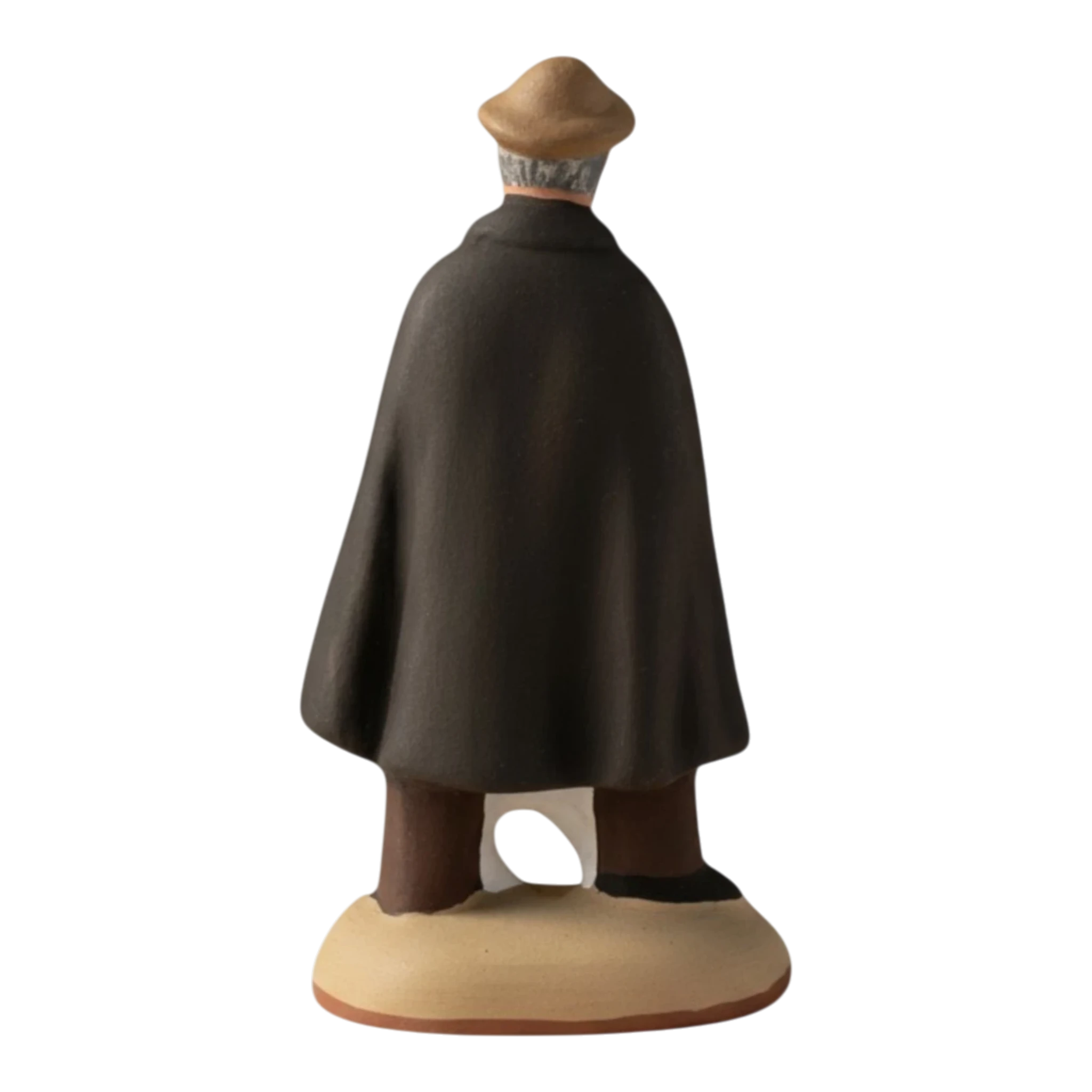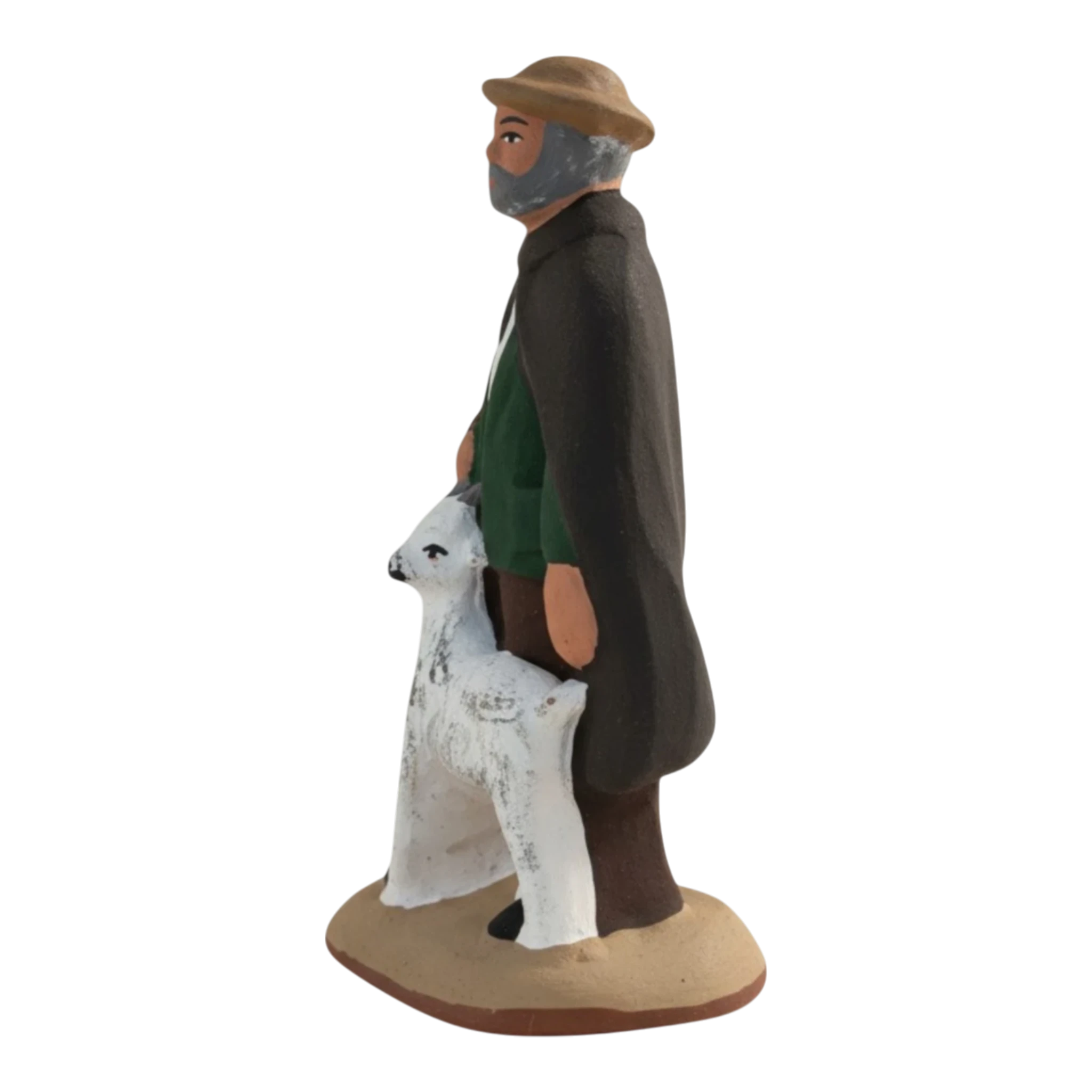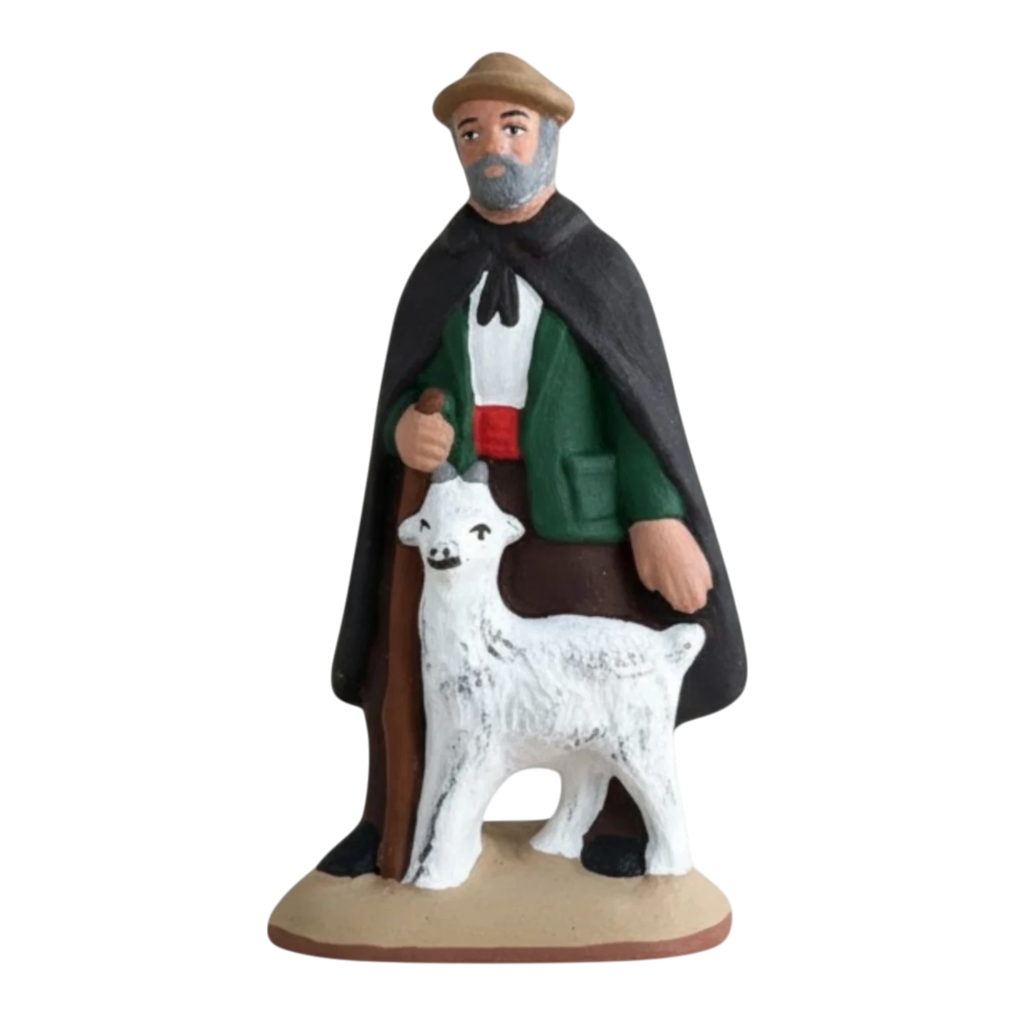 Ce santon capture cet instant de calme absolu. Ce vieux berger, au regard bienveillant et à la barbe soigneusement peinte, n’est pas seul : sa petite chèvre blanche s’est blottie contre lui, cherchant protection et caresses au pied de son maître. C’est une scène de tendresse pure, loin du tumulte, qui rappelle que la crèche est avant tout un refuge de paix.