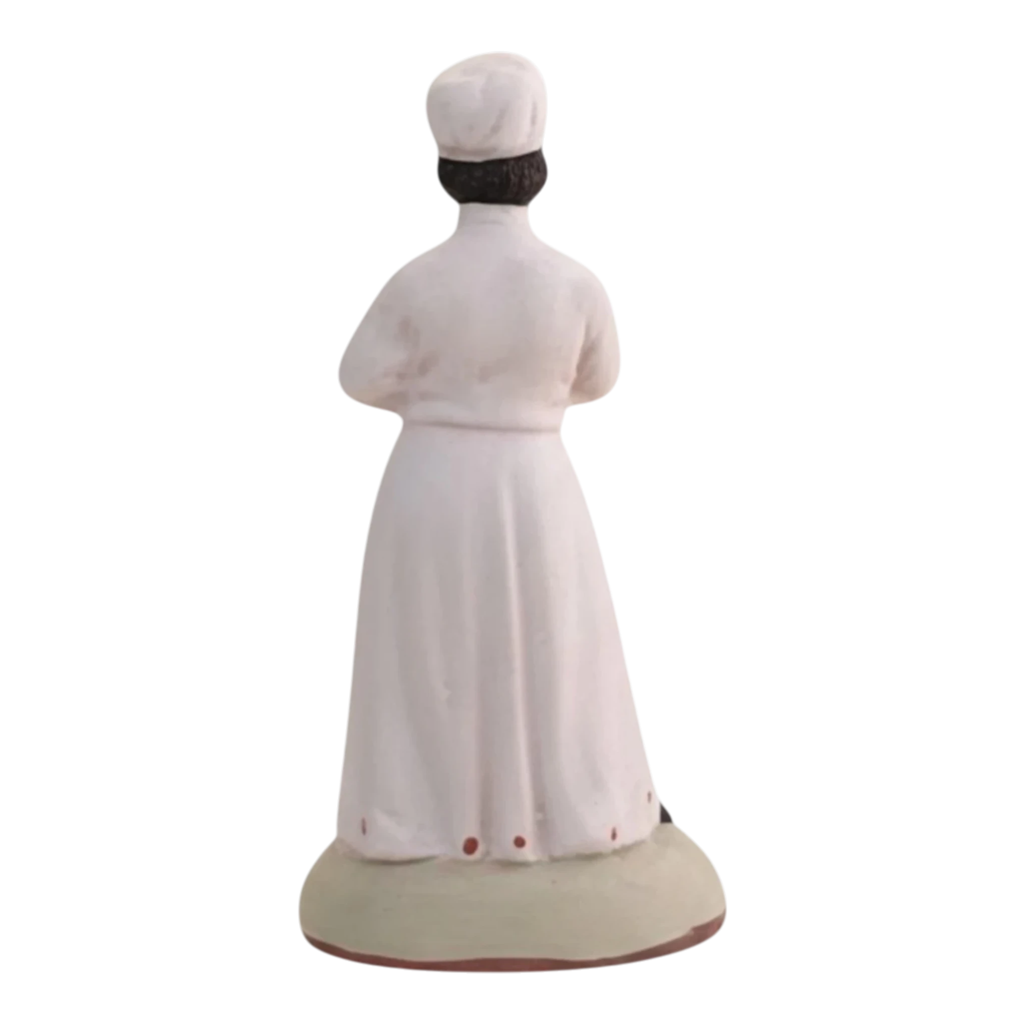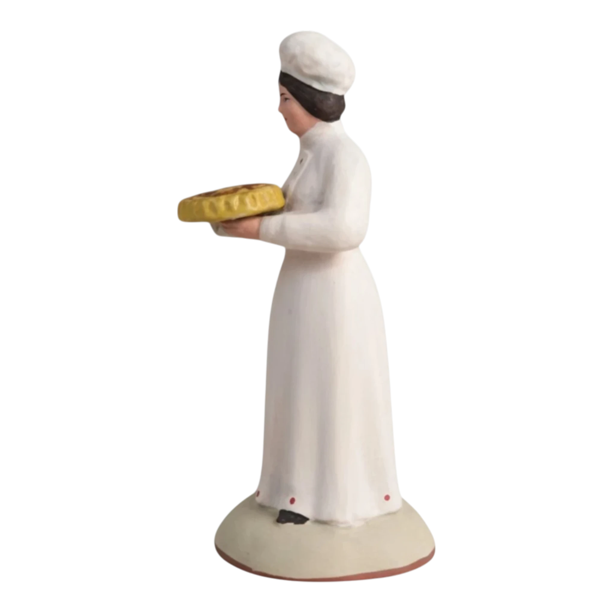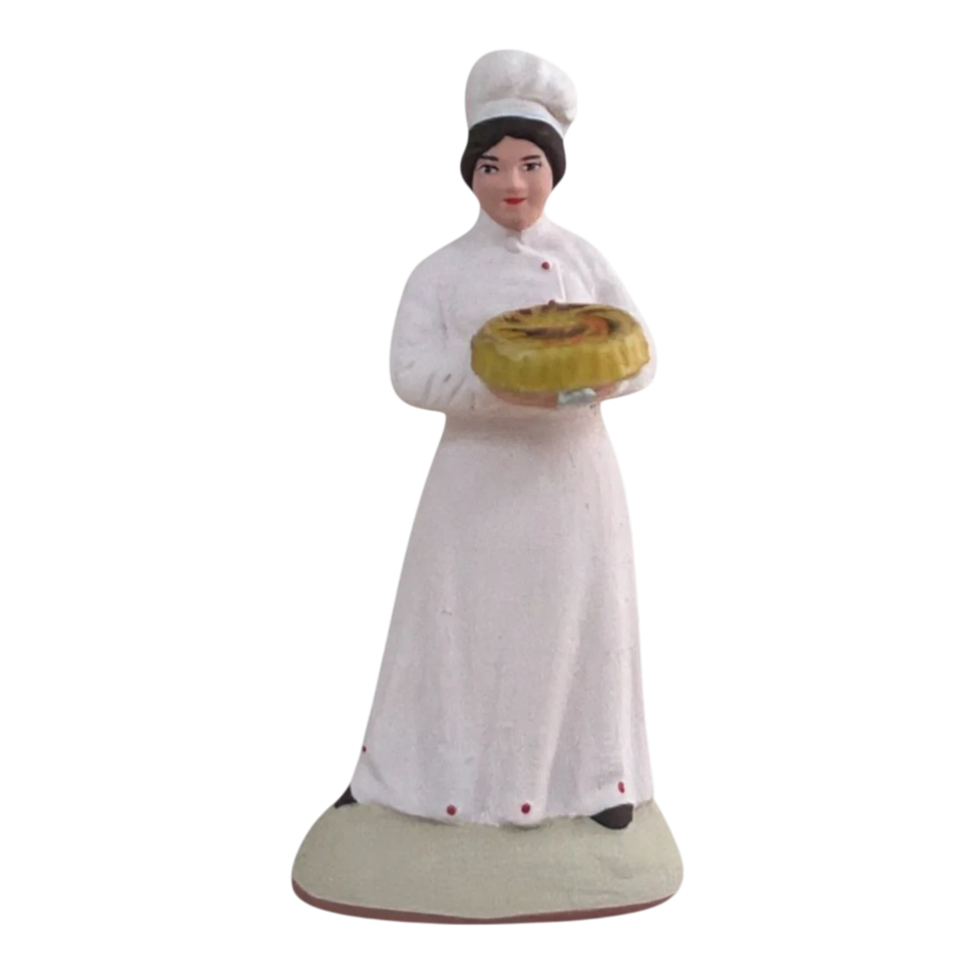 Cette figurine artisanale représente le savoir-faire de la pâtisserie française. Vêtue de sa toque et de son tablier blanc immaculé, elle présente fièrement une galette des rois dorée, prête à être partagée. C’est le personnage idéal pour animer votre village provençal au moment de tirer les rois.